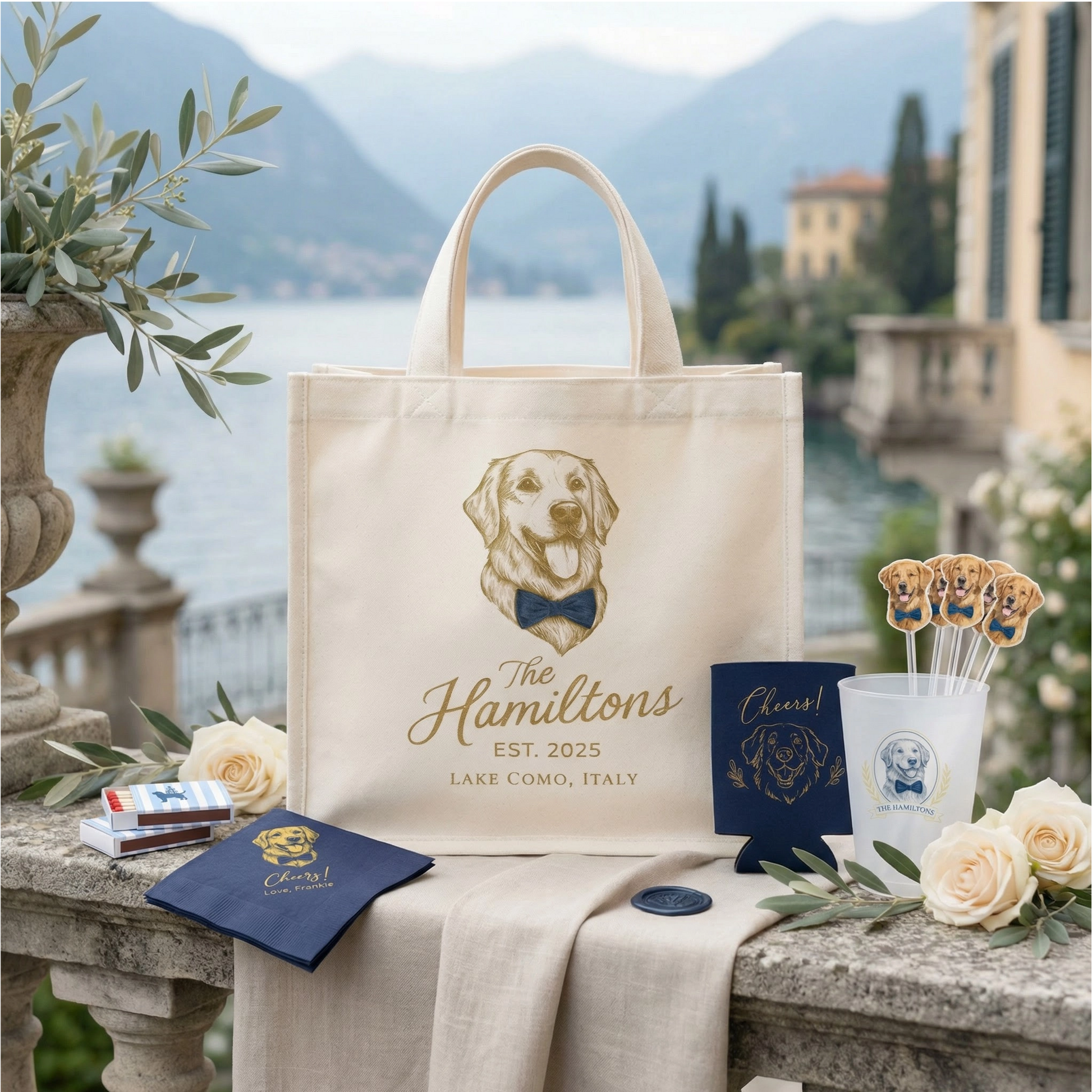 “Our golden retriever couldn't be at our destination wedding, so having her illustrated on everything was the next best thing. Guests were genuinely moved by the detail.”